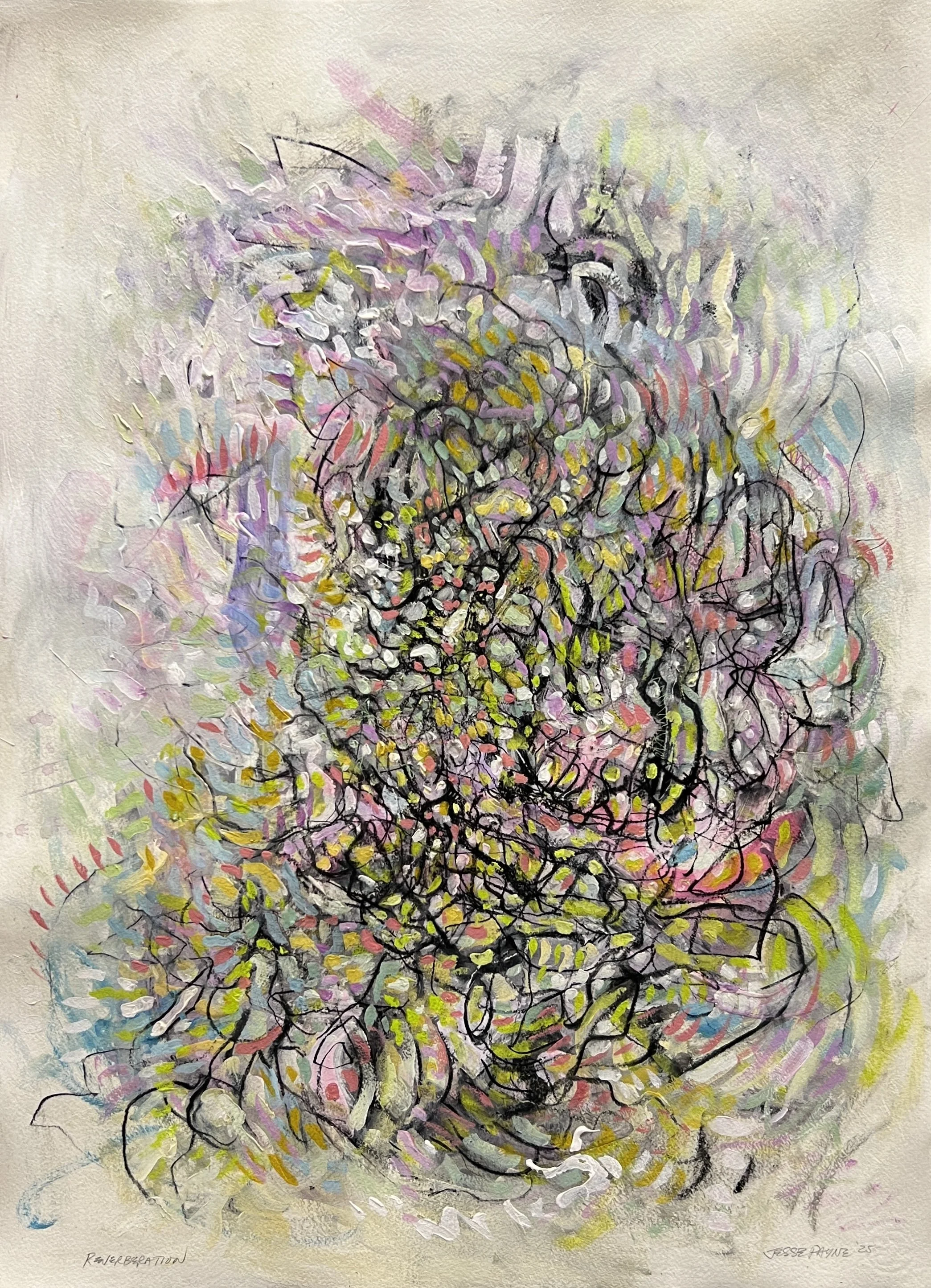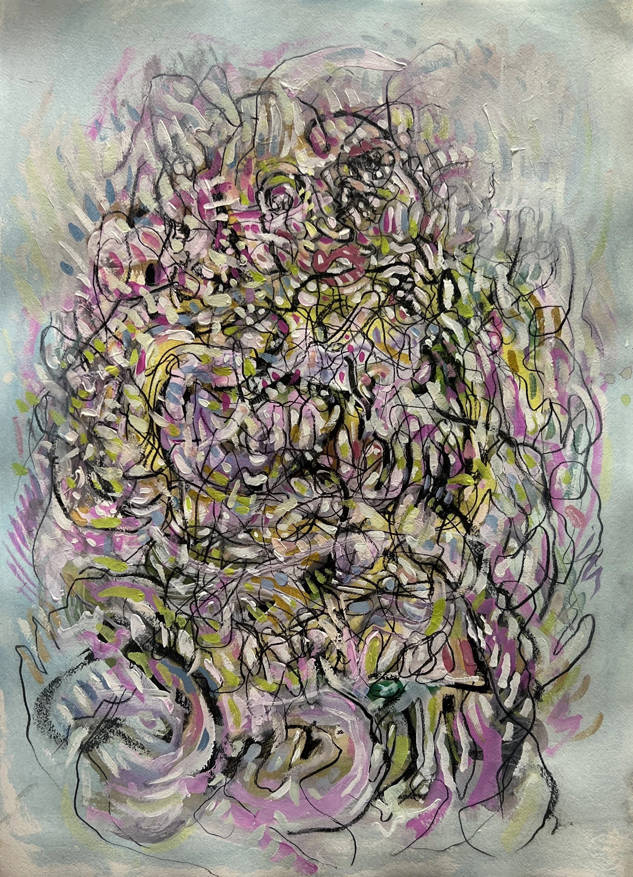 Disrupted Portals is a body of work that emerges from the tension between figuration and dissolution, structure and chaos. Beginning with recognizable sources—skeletal fragments, human figures, and archetypal forms—these drawings evolve into portals, thresholds where matter dissolves into energy.